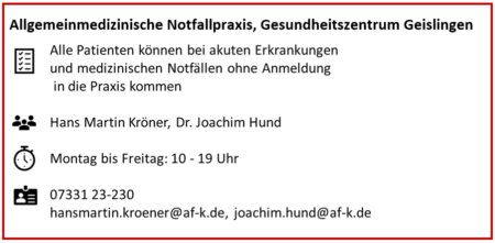 Derzeit wird in den Medien über die Schließung von Notfallpraxen der Kassenärztlichen Vereinigung in Baden-Württemberg berichtet. Diese Notfallpraxen stehen jedoch in keinem Zusammenhang mit der Allgemeinmedizinischen Notfallpraxis des ALB FILS KLNIKUMS im Gesundheitszentrum in Geislingen.