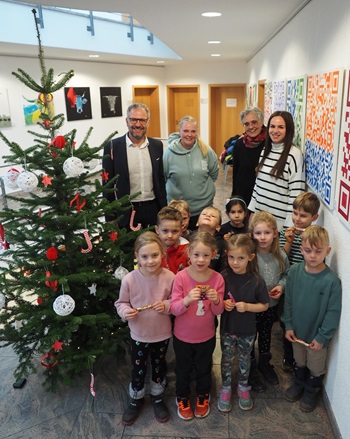 Es ist mittlerweile eine gute Tradition geworden,dass immer im Wechsel die Vorschulinder eines Uhinger Kindergartens immer im jährlichen Wechsel das Rathaus besuchen und dort einen Baum mit selbstgebasteltem Schmuck dekorieren. Dieses Jahr kamen 5 Mädchen und 5 Jungen des Uhinger Kinderhauses am Haldenwald vorbei. „Seit vergangener Woche haben sie gebastelt und alles vorbereitet“,erzählt Kindergartenleiterin Kristine Oswald stolz. Zusammen mit Kollegin Stephanie Hänel begleitete sie die Kinder ins Rathaus,wo sie den Baum verzierten. Sie schmückten ihn mit Zuckerstangen aus Bügelperlen,Weihnachtskugeln aus Schnüren,Weihnachtssternen und andere Figuren aus Papier. Danach holten sie Uhingens Bürgermeister Matthias Wittlinger aus einer Sitzung und sangen zunächst volle Freude „Kling Glöckchen“,ehe sie ihm stolz den Baum zeigten. „Wow,ich bin begeistert“,sagte Matthias Wittlinger und lobte weiter: „Das habt ihr toll gemacht! Jetzt können sich die Mitarbeiter im Rathaus und Besucher an eurem Weihnachtsbaum erfreuen. Ihr habt für die Weihnachtszeit Freude in Rathaus gebracht.“