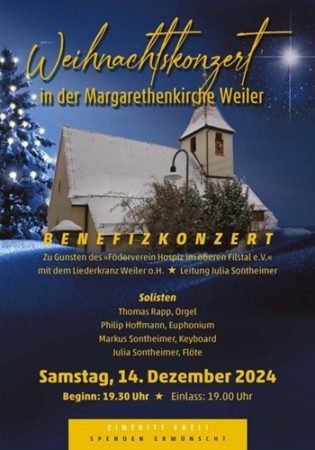 Ein weiteres Highlight erwartet die Besucher am 14. Dezember mit einem Weihnachtskonzert,dessen Erlös zu Gunsten des „Fördervereins Hospiz im oberen Filstal e. V. “ gespendet werden wird. Neben dem Männerchor werden als Solisten Thomas Rapp (Orgel),Philip Hoffmann (Euphonium),Markus Sontheimer (Keyboard) und Julia Sontheimer (Flöte) musizieren.