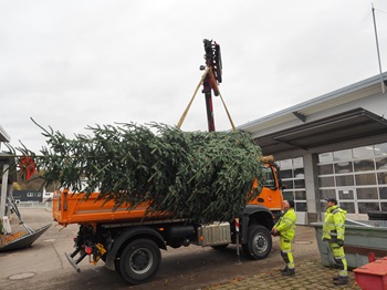 Seit wenigen Tagen stehen im gesamten Stadtgebiet von Uhingen stumme Boten,die auf die Weihnachtszeit einstimmen sollen: Christbäume. Der städtische Bauhof stellte 7 große Bäume in Uhingen,beispielsweise vor dem Rathaus,sowie in den Stadtteilen an markanten Plätzen auf. Hinzu kamen zahlreiche kleinere Bäume für die Kindergärten sowie Grundschulen und weiterführenden Schulen.Der Bauhof stellte die großen Bäume mit 2 Trupps bestehend aus je 2 Angestellten und mithilfe eines Lkw-Kranes auf. Manchmal musste mittels Kettensäge der Baumstamm an die im Boden befindliche Hülse angepasst und verkleinert werden. Und wenn der Stamm dann endlich schmal genug war und in der Bodenhalterung versenkt werden konnte,erfolgte die Feinausrichtung mittels Holzkeilen.Manchmal bekam das Bauhof-Team bei seiner Arbeit Gesellschaft,wie etwa in Nassachtal. Dort brachte ein Anwohner dem Bauhof Kaffee – vielmehr zur Stärkung als zum Aufwärmen. Denn trotz Kälte wurde es den Bauhof-Mitarbeitern durch das intensive Arbeiten mollig warm. Dass der aufmerksame Bürger wusste,was den emsigen Schaffern gut tut,kam nicht von ungefähr: Er klotzte bis vor wenigen Monaten selbst beim Bauhof ran – und nutzte die Gelegenheit zu einem Plausch mit seinen ehemaligen Kollegen. „Einmal Bauhof,immer Bauhof“,sagt Bauhofleiter Dennis Schaser über die schöne Geste des ehemaligen städtischen Mitarbeiters.Doch das Team des Bauhofs rackert nicht nur,sondern geht auch mit genügend Humor an die Arbeit. In Anlehnung an den Brauch des Christbaumlobens sagten sie jedes Mal,nachdem ein Baum stand: „Oh,was für ein schöner Baum!“ war dann zu hören. „Aber anders als beim richtigen Christbaumloben gab es für unsere Trupps weder Schnaps noch Gutsle,sondern die Gewissheit,mit dem Aufstellen der Bäume die Mitmenschen auf die Weihnachtszeit einzustimmen.“Foto (Stadt Uhingen): Insgesamt stellte der Bauhof 7 große im gesamten Stadtgebiet auf und lieferte Schulen und Kindergärten kleinere Exemplare.PM Stadtverwaltung Uhingen