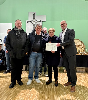 Foto (Stadtverwaltung Geislingen an der Steige / Teresa Christmann): Dekan Martin Ehrler,der ehemalige Göppinger Oberbürgermeister Guido Till,Ministerin Nicole Razavi und Oberbürgermeister Frank Dehmer bei der Spendenübergabe (von links nach rechts)
