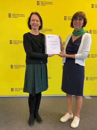 Foto (Quelle: Regierungspräsidium Stuttgart): Regierungspräsidenten Susanne Bay (links) übergibt Christine Baur-Fewson,Direktorin der Autobahn GmbH Niederlassung Südwest,am 18. Dezember 2024 den Planfeststellungsbeschluss für den neuen A 8-Albaufstieg.