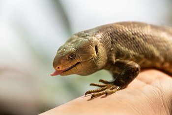 Foto (Wilhelma Stuttgart/Birger Meierjohann): Gerade einmal eine Woche alt,aber von einer respektablen Größe: Junger Wickelschwanzskink bei seiner ersten Gesundheitskontrolle in der Wilhelma.