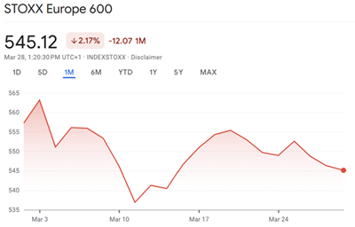 Nicht nur der amerikanische Markt,sondern auch europäische Unternehmen sind von den Handelszöllen betroffen,mit einem Kursabfall von 2,17 % für den STOXX Europe 600,der die 600 stärksten europäischen Unternehmen nach Marktkapitalisierung abbildet.