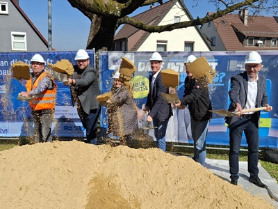 Foto (v. l. n. r.): Armin Stoll (Bauunternehmung Leonhard Weiss),Alex Maier (Oberbürgermeister der Stadt Göppingen),Claudia Bressmer (Bezirksleiterin Jebenhausen),Andreas Bantel (EVF-Geschäftsführer),Alfred Wallender (Fa. Imos),Peter Naab (EVF-Geschäftsführer)