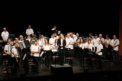 Musikerinnen und Musiker,Sängerinnen und Sänger des Uhinger Projektorchesters begeisterten das Publikum des Uditoriums. Sie hatten sich eigens für das Stadtjubiläum zusammengefunden. Unter der Leitung von Yvonne Kolberg (Musikschule) und Achim Ziegele (Musikverein) sowie Lothar Bargiel (Harmonika-Orchester) war ein professionelles Ensemble entstanden,das mit seinem breiten Repertoire vom „Uhinger Lied“,dem „Uigo-Marsch“ bis zum „Schatz-Walzer von Johann Strauß Sohn und „Under the sea“ aus dem Disney-Klassiker „Die kleine Meerjungfrau“ seine große Virtuosität unter Beweis stellte. Und den Bürgermeister noch einmal träumen ließ – „von einem Uhinger Stadtorchester!“