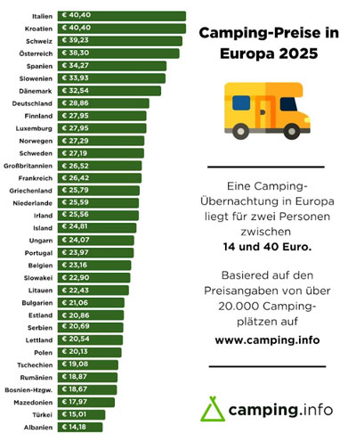 Alle Camping-Preise in weiteren europäischen Ländern pro Nacht in Europa: www.camping.info/preisvergleich