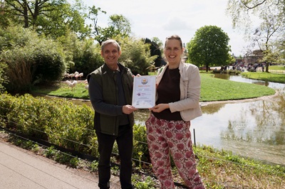 Foto (Wilhelma Stuttgart/Jennifer Riexinger): Wilhelma-Direktor Dr. Thomas Kölpin nimmt von Dorothee Spengler,der Landesvorsitzenden Baden-Württemberg des Verbands kinderreicher Familien Deutschland e.V.,das Fair Family-Gütesiegel entgegen.