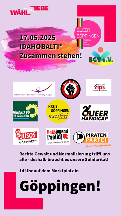 Queere Menschen sind in Baden-Württemberg 2024 häufiger Opfer von Hasskriminalität geworden. Gegenüber dem Vorjahr um 30 Prozent auf 165 Fälle,wie das Innenministerium jüngst veröffentlichte. Dieser Opfer wird weltweit am 17. Mai am IDAHO-BALTI*-Tag gedacht. Auch in Göppingen.