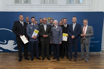 Foto (Innenministerium Baden-Württemberg / Leif Piechowski): v.l.n.r.: Markus Arnold,Steffen Kwiatkowski,Alexander Baur,Uwe Pawlitschko,Tobias Vester,Innenminister Thomas Strobl,Philipp Damm,Edmund Baur,Michael Schilling,Ralf Kreidenweiß,Christian Bruchner,Andreas Aschbacher,Ulli Hockenberger MdL