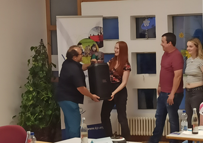 Foto: Überreichung des Partylautsprechers von KJR-Vorsitzendem Achim Kuhn an Rebecca Specht und das Team von Rainbow City