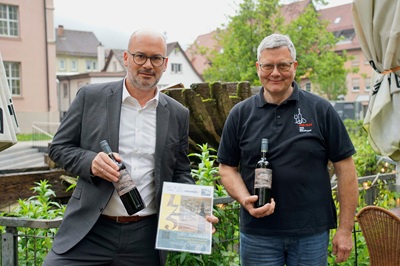 Foto (Christiane Wehnert): Jubiläumswein – Oberbürgermeister Frank Dehmer und Weinhändler Uwe Haas