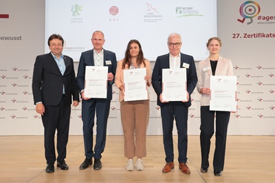 Für seine kontinuierlich familien- und lebensphasenbewusste Personalpolitik wurde das Landratsamt Göppingen erneut mit dem Zertifikat zum audit berufundfamilie ausgezeichnet. Seit 2021 gestaltet die Landkreisverwaltung ihre Maßnahmen zur besseren Vereinbarkeit von Beruf,Familie und Privatleben strategisch mit dem audit berufundfamilie,das als nachhaltiges Managementinstrument die Vereinbarkeit systematisch fördert und weiterentwickelt. Bereits zum zweiten Mal erhielt das Landratsamt nun das Zertifikat. Überreicht wurde es an Landrat Edgar Wolff durch Oliver Schmitz,Geschäftsführer der berufundfamilie Service GmbH,bei einer feierlichen Veranstaltung am Dienstag,17.06.2025 in Berlin.