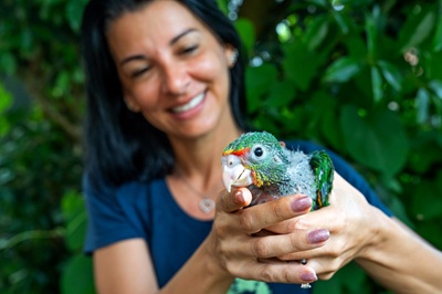 Foto (© 1: Wilhelma Stuttgart/Birger Meierjohann): Vanessa Kanaan begleitet den Gesundheitscheck bei einem Jungvogel der Taubenhalsamazonen in der Wilhelma. In ihrer brasilianischen Heimat leitet sie ein Schutzprojekt für die stark gefährdete Art.