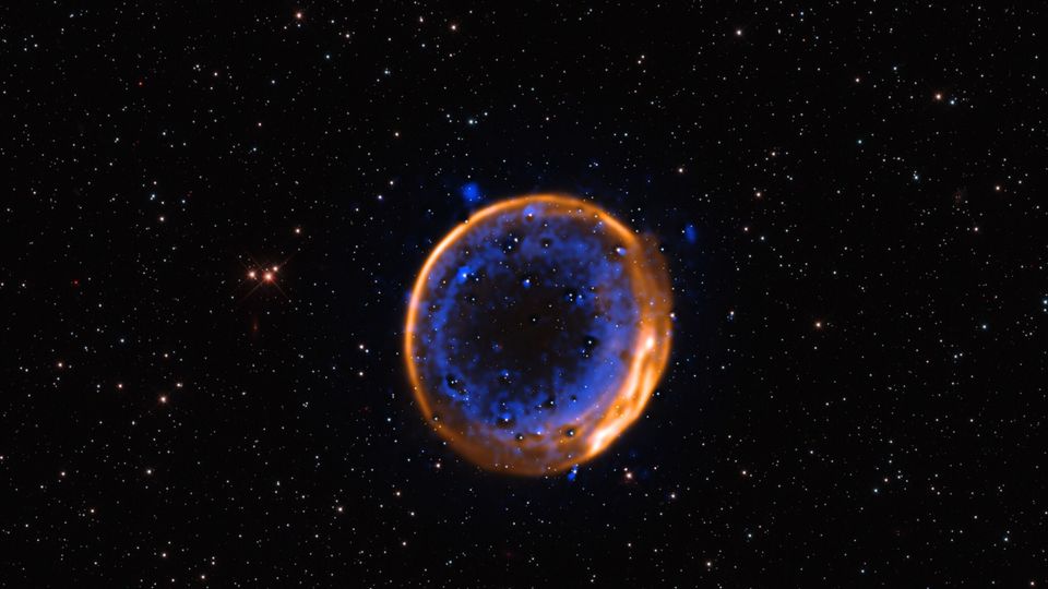 Wenn ein Stern explodiert,sprechen Astronomen von einer Supernova. Und manchmal knallt es dabei nicht nur einmal,sondern gleich zweimal,wie jetzt ein internationales Forschungsteam erstmals nachweisen konnte. Bei einer 160.000 Lichtjahre entfernten Gaswolke in der Großen Magellanschen Wolke,einer Satellitengalaxie der Milchstraße,handelt es sich um den Überrest einer solchen doppelten Sternexplosion,wie die Wissenschaftler im Fachblatt »Nature Astronomy« berichten