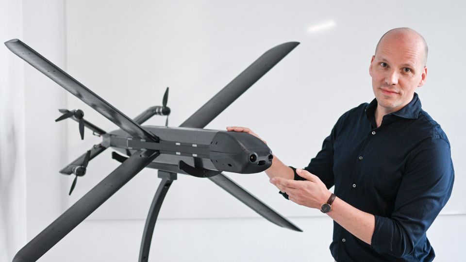 Helsing-Mitgründer Scherf mit Modell der aktuellen HX-2-Drohne: Die Ukraine noch besser unterstützen