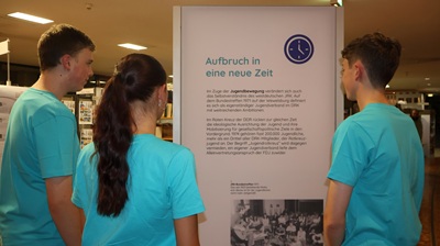 Die Ausstellung,die auf großen Tafeln im Eingangsbereich und in den Räumen der Stadtbibliothek zu sehen ist,macht augenscheinlich,dass auch das JRK immer von politischen Gegebenheiten beeinflusst war. Thematisiert wird die Instrumentalisierung durch die Nationalsozialisten,der Neubeginn nach 1945,aber auch die Neugründung nach der Wende in den neuen Bundesländern. Sie verdeutlicht auch,dass sich das JRK immer wieder selbst positioniert hat,in Kampagnen gegen Kindersoldaten oder als Klimahelfer.
