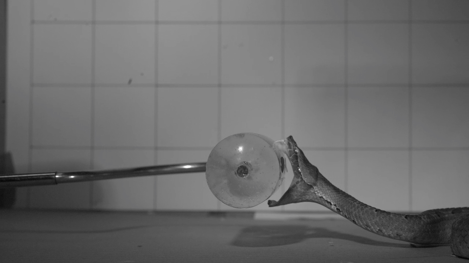 Eine Viper beißt im Laborversuch vor laufender Kamera in einen Gelklumpen